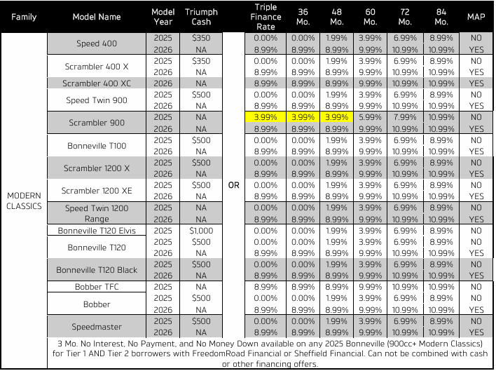 Triumph Triple Financing or Traditional Financing with rates as low as 0.00% APR for 36 months on select models with FreedomRoad Financial are eligible for both Tier 1 AND Tier 2 applicants.*** Triumph Triple Financing also available for a 24-mo. term on 400cc models only.